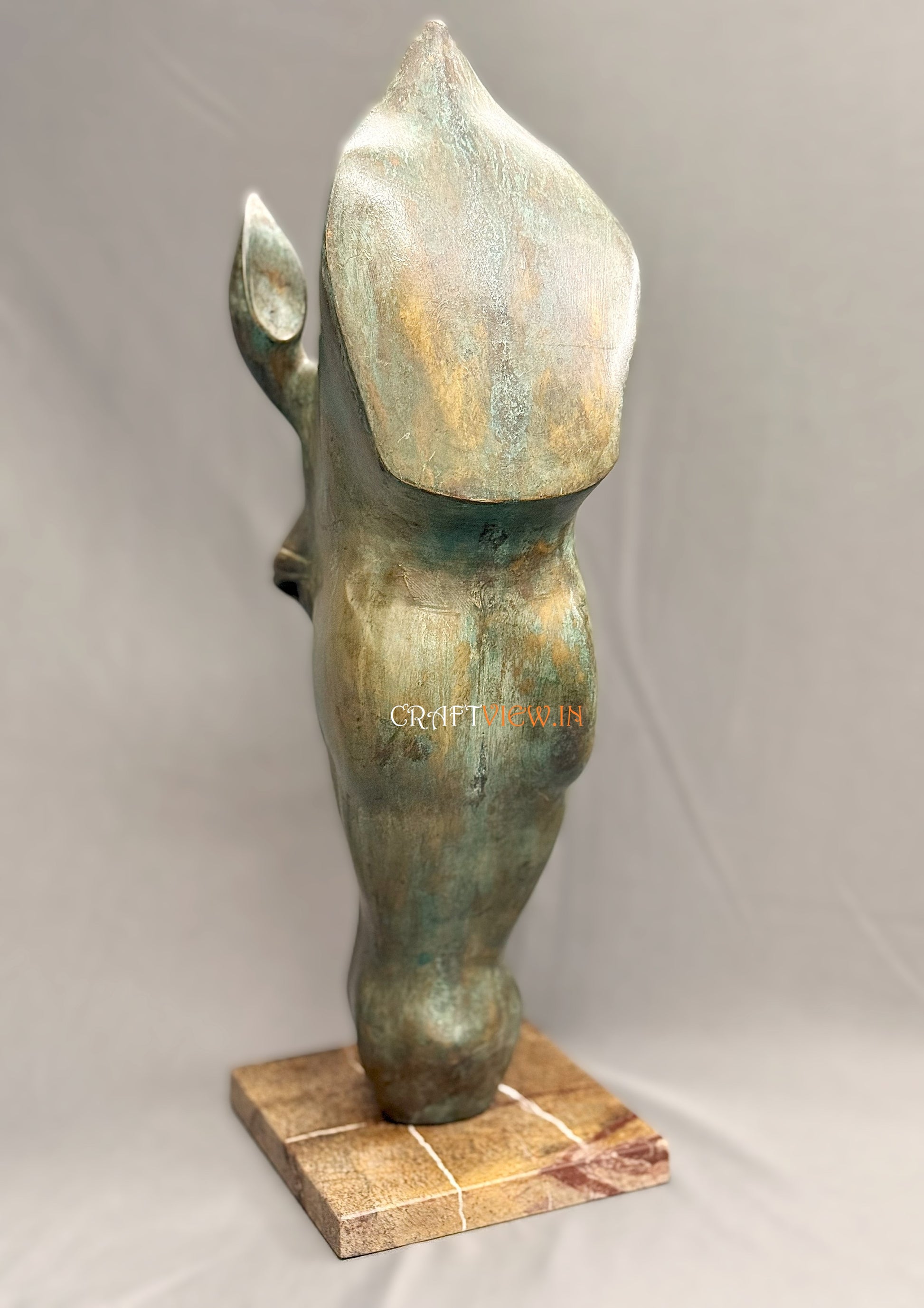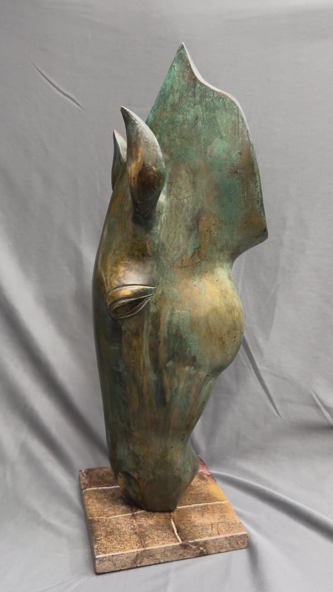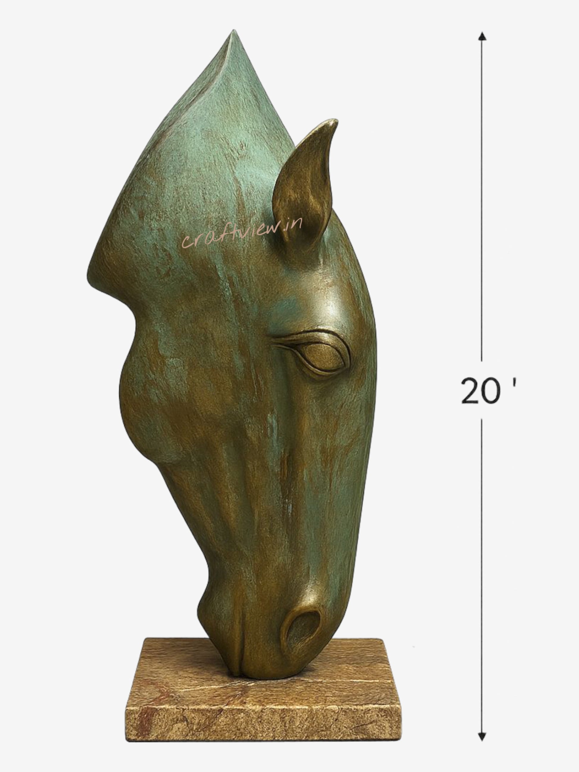 Crafted with precision and artistic sensitivity, this 20-inch tall horse head sculpture features a sleek, abstract form that seamlessly blends traditional subject matter with contemporary design. The patina finish – a beautiful mix of bronze tones with touches of aged green – adds an antique charm that is both rustic and modern.