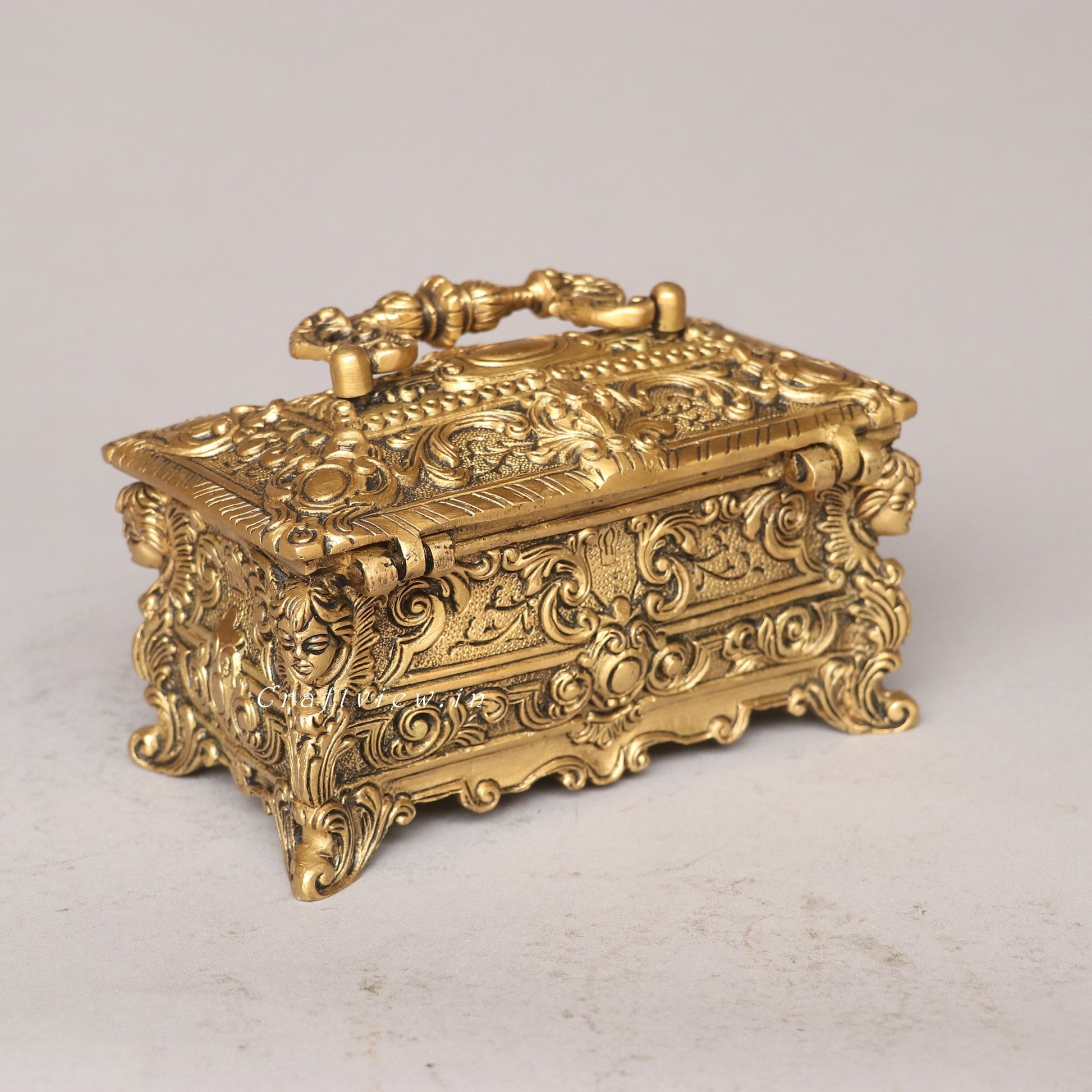 Brass has been used for centuries to create everything from musical instruments to ornate household items. Its durability, malleability, and golden luster make it an ideal material for decorative pieces. A brass jewelry box like this one often draws inspiration from various artistic movements, such as:
