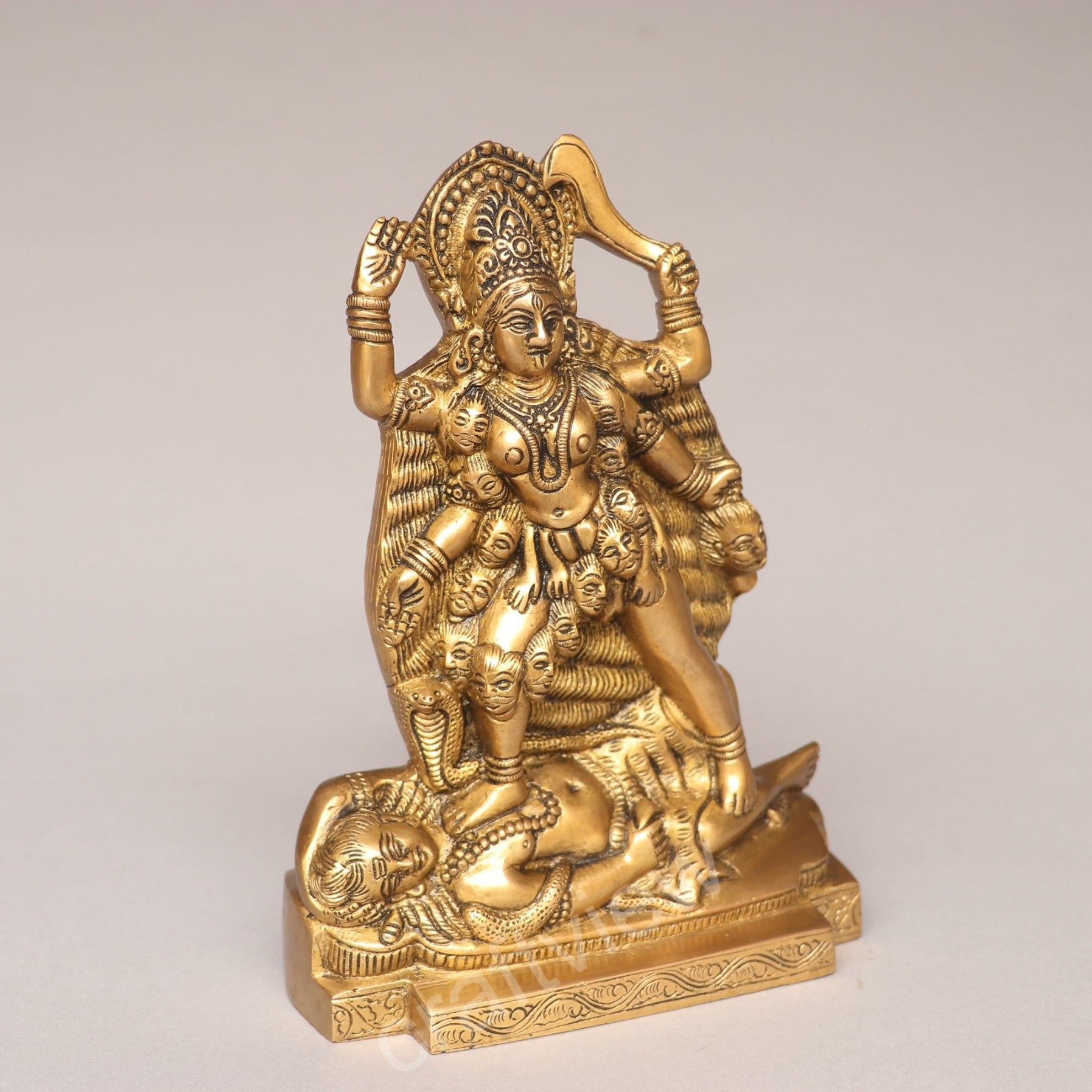 This idol is meticulously handcrafted in solid brass, reflecting detailed artistry in every curve and engraving. The ornate crown, expressive facial features, and intricately carved ornaments bring alive the divine form of Kali Maa. The golden brass finish not only enhances its beauty but also makes it a timeless addition to any home temple or spiritual space.