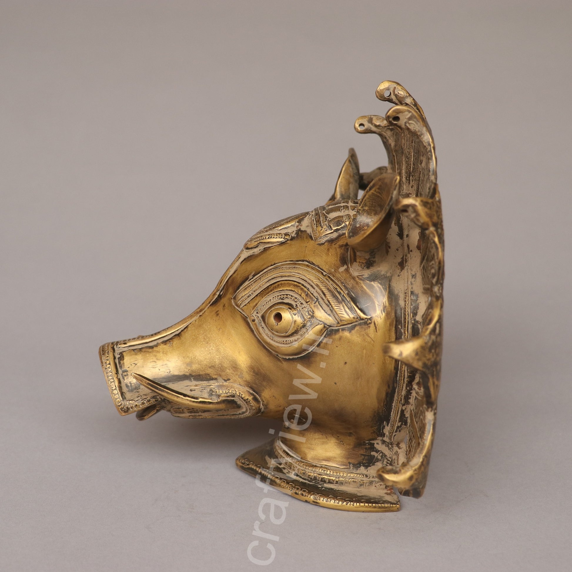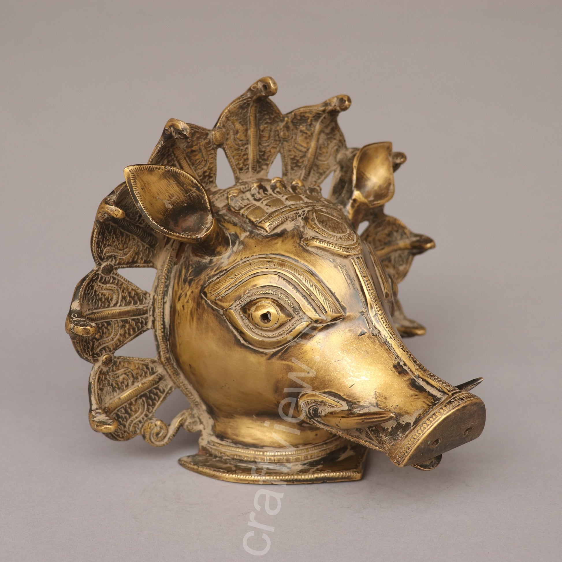 Antique finish brass Varaha mask crafted in superfine finishing captures the essence of the story where Vishnu assumes the form of a boar to rescue the Earth, personified as Bhudevi, from the clutches of the demon Hiranyaksha. The Varaha Avatar, one of Lord Vishnu's principal incarnations.